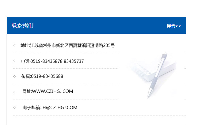 地址:常州市新北區友邦商務大廈1幢16、17層  電話:0519-85101652  傳真:0519-85112595  郵編:213022  網址:www_cz-jiayue_cn.shihuzsj.com  郵箱:xiajifengaa@163.com